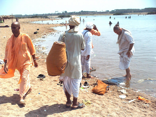 Sripad Bhakti Prapanna Tirtha Maharaj explained to the devotees about the divine pastime of Lord Chaitanya Mahaprabhu which occurred here. This was a discussion between Mahaprabhu and Raya Ramananda, that took place on the banks of Godavari river in Kovvur. All the devotees took the blessings of the holy Godavari River, all the while remembering the divine pastime of Mahaprabhu and Raya Ramananda.