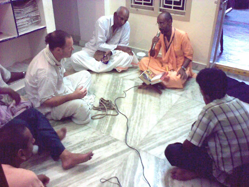 In the evening, devotees gathered in the house of Sripad Krsna Prema Prada Prabhu's house to hear nectarine Krsna katha from lotus lips of Sripad Bhakti Prapanna Tirtha Maharaj. Sripad Bhakti Prapanna Tirtha Maharaj was constantly chanting the glories of Mahaprabhu's visit to the South India from the famous Sri Sri Prema Dhama Deva Stotram (condensed version of the Chaitanya Charitamrita), composed by Srila Bhakti Rakshak Sridhar Dev-Goswami Maharaj (download). The devotees were completely absorbed in hearing the sweet nectarine pastimes of Lord Gaura Hari. Download nectar here. After hearing the Sri Sri Prema Dham Deva Stotram, Sripad Nama Sankirtan Prabhu was so ecstatic, that he translated a few verses of Prema Dham Deva Stotram into Telugu on Narasimha Chaturdasi day, 8th May 2009. He was constantly explaining to all devotees the glories of Prema Dham Deva Stotram in great ecstasy.