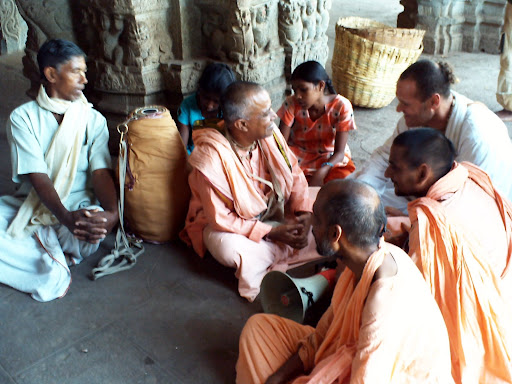 By the divine arrangement of the Lord, the devotees reached Ahobalam on Narasimha Chaturdasi (8th May 2009), where Lord Narasimha Dev appeared from a pillar and killed the great atheistic demon, Hiranyakashyapu to give protection to His dear most devotee, Sripad Prahlad Maharaj. Sripad Bhakti Prapanna Tirtha Maharaj constantly engaged devotees in chanting the divine glories of Sripad Prahlad Maharaj and Lord Narasimha Dev (download mp3).