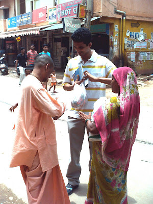 On the 15th May 2009, there was a Nagar Sankirtan performed in Bangalore, near Sripad Ramesh Prabhu's house (download Mp3). On the morning of the 16th, devotees went out on Nagar Sankirtan to carry out book distribution in Bangalore, under the order of our Guru Parampara. In the evening there was sadhu sanga in the house of Sripad Ramesh Prabhu in the holy association of Sripad Bhakti Prapanna Tirtha Maharaj. In the satsanga, many friends of Sripad Ramesh Prabhu and Sushen Krsna Das joined. All the participants were highly educated (M.Techs and Ph.D.s from the Premier Institute of India; such as IITs and IISc). Sripad Bhakti Prapanna Tirtha Maharaj and Sripad Jagadananda Prabhu blessed everyone present with nectarine Hari katha. Sushen Krsna Das gave a scientific presentation on the Vedantic conception of life (Download Mp3).